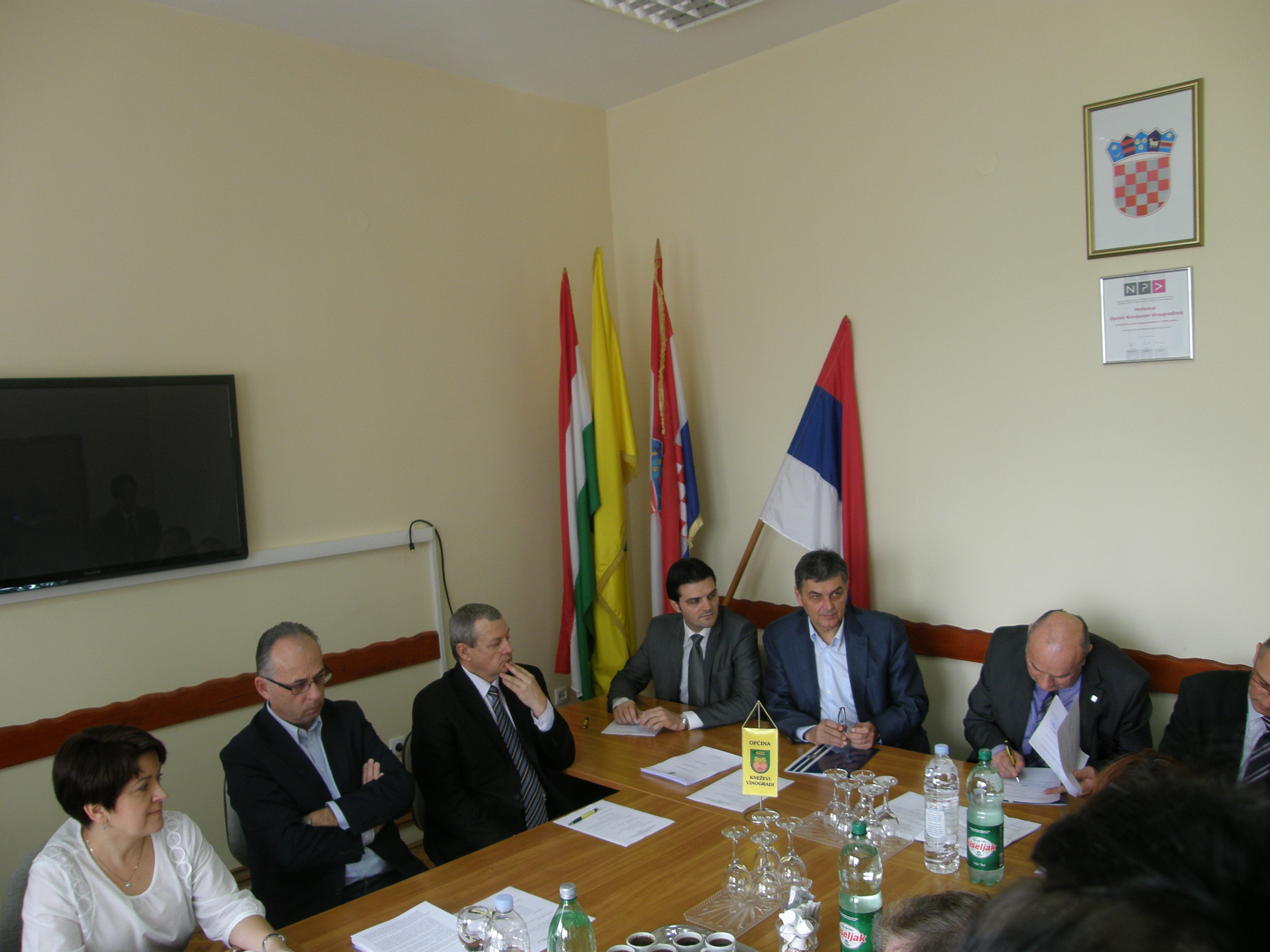 Povod je potpisivanje Sporazuma između Županije, Hrvatskih voda i Općine Kneževi Vinogradi kojim će se financirati izrada glavnog projekta za izgradnju taložnice i propusta u Karancu, čijom će izgradnjom biti spaseni sjeverni dijelovi naselja Karanac, uslijed velikih oborina.